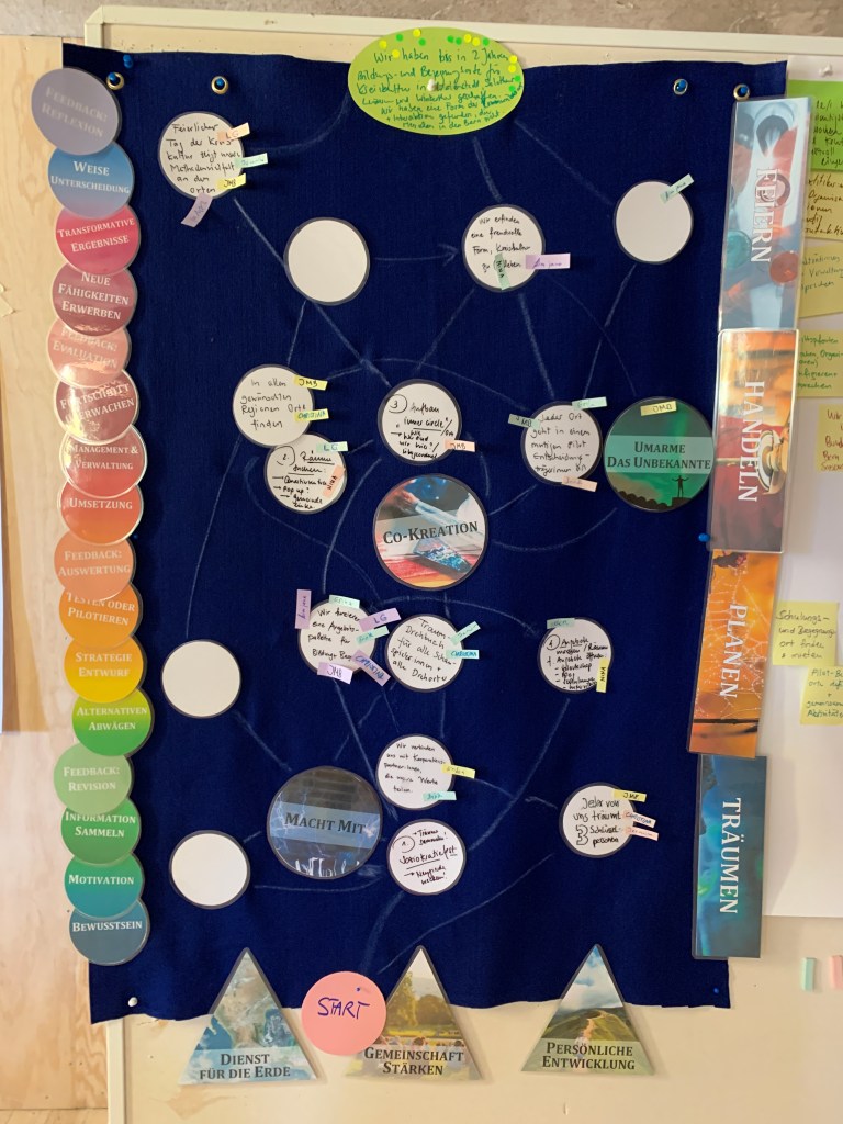 Besonders in der Planungsphase fördert das Vorgehen im Dragon Dreaming eher unsere intuitive und spielerische Seite. Es kommt mir entgegen, dass keine Tabelle ausgefüllt wird, sondern ein Netzwerk von Aufgaben auf einer sinnlich ansprechenden Wand entsteht.
